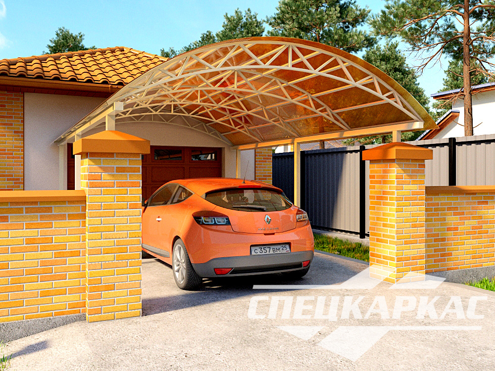 Компания «Спецкаркас» предлагает козырьки, беседки, навесы из поликарбоната любого типа и формата: одно- и двухскатные, прямые и наклонные, арочные и даже куполообразные.