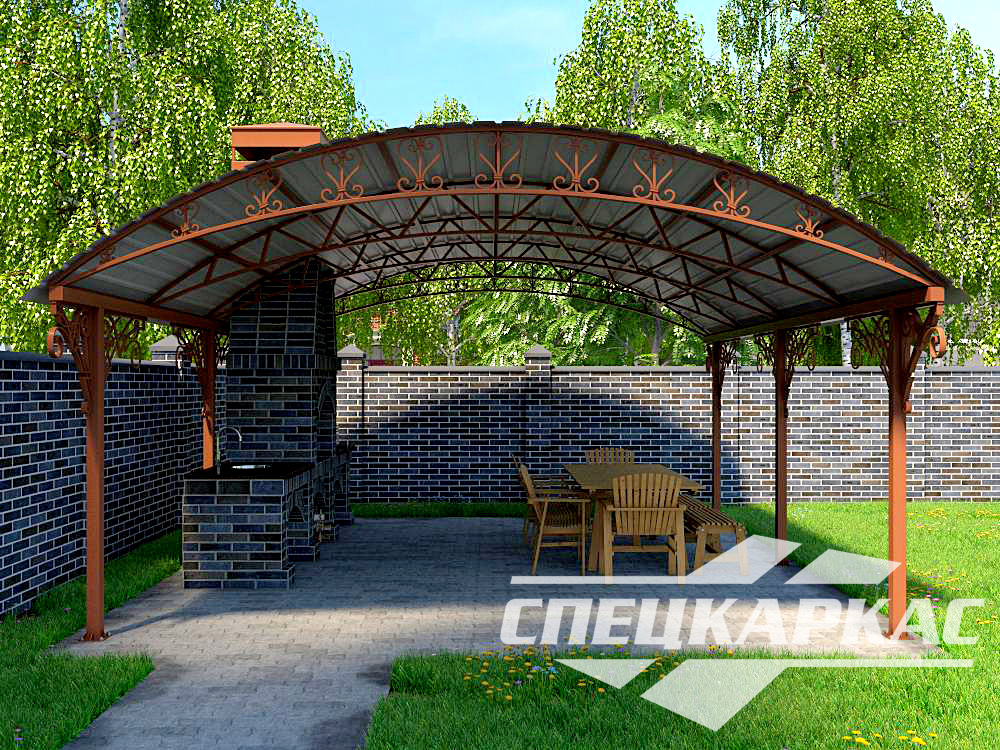 Компания «Спецкаркас» предлагает козырьки, беседки, навесы из поликарбоната любого типа и формата: одно- и двухскатные, прямые и наклонные, арочные и даже куполообразные.